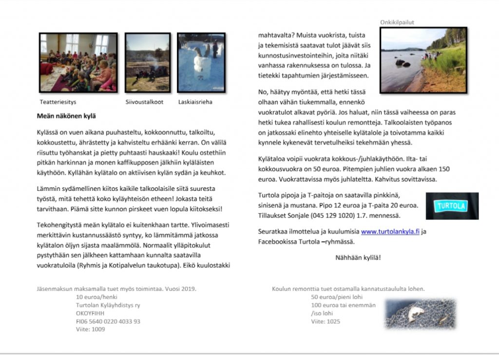 Joulukuun 19. päivänä tullee tasan sata vuotta siitä, ko sähkö tuli Turtolhaan. Olisko siinä aihetta juhlaan? Miten met tätä merkittävvää päivää juhlistaisimma? Jos tämä herättää sinussa ajatuksia, ota yhteyttä Sonhjaan, sonjakonola@gmail.com.